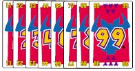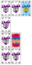 Between the numbers, each card shows from one to seven bullheads. When a player has to pick up cards, each bullhead represents one minus point.