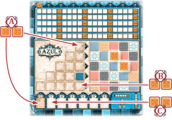 Any tiles you have picked that you cannot or do not want to place according to the rules, you must place in your floor line, filling its spaces from left to right. These tiles are considered as having fallen on the floor and give minus points in the Wall-tiling phase.