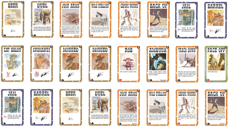 Some cards (Barrel, Jail, Dynamite) show little poker suits and values, then an equal sign and then their effects. The player using such a card must "draw!", i.e. he has to flip over the top card of the deck, discard it, and look at the poker symbol in the lower left corner.