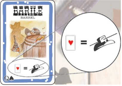 Some cards (Barrel, Jail, Dynamite) show little poker suits and values, then an equal sign and then their effects. When you want to use such a card you must "draw!", i.e., you have to flip over the top card of the deck, discard it, and look at the poker symbol in the lower left corner.