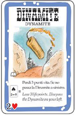Dynamite: Play this card in front of you: the Dynamite will stay there for a whole turn. When you start your next turn (you have the Dynamite already in play), before the first phase you must "draw!"