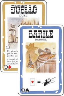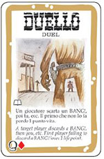 Duel: With this card you can challenge any other player (staring him in the eyes!), regardless of the distance. The challenged player may discard a BANG! card (even though it is not his turn!).