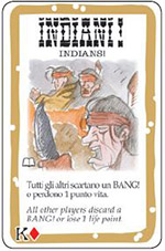 Indians!: each player, excluding the one who played this card, may discard a BANG! card, or lose one life point.