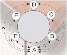 In the figure, if A has a Scope in play, he would see B and F at a distance of 1, C and E at a distance of 1, D at a distance of 2, while A would be seen by other players at a normal distance.