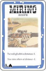 Scope: when you have a Scope in play, you see all the other players at a distance decreased by 1. However, other players still see you at the normal distance. Distances less than 1 are considered to be 1.