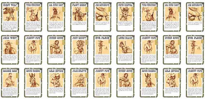Vulture Sam (4 life points): whenever a character is eliminated from the game, Sam takes all the cards that player had in his hand and in play, and adds them to his hand.