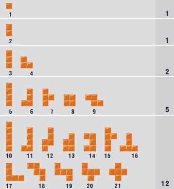 - 1 two-square piece 12 five-square pieces