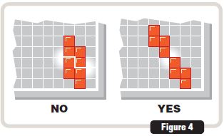 Players take turns laying down one piece at a time. Each new piece must touch at least one other piece of the same color, but only at the corners. Pieces of the same color can never touch along a side. (See Figure 4)