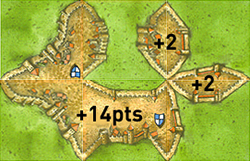 A player who owns a knight in a completed city scores 2 points per tile used in the city. Each shield or banner in the city gives the player 2 bonus points.