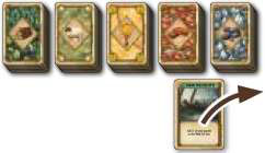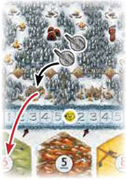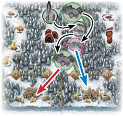 If there are multiple wildlings in that clan area, the wildling in the camp closest to the numbered trails advances. The other wildlings in that clan area each move 1 camp closer to the clearings to fill unoccupied camps.