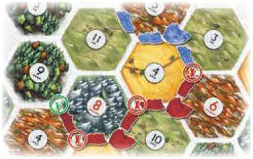 Road Build Example: Blue may build a road on the paths marked in green. Blue cannot build on the path marked in red, for yellow's settlement blocks the way.