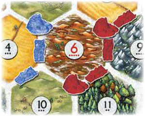 Example: If a "6" is rolled, Red receives 2 brick for his 2 settlements. Blue receives 1 brick for his 1 settlement. If a "4" is rolled, Blue receives 1 grain. If Blue's settlement were a keep, he would receive 2 grain instead.
