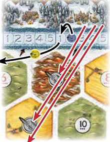 How do you get resources? It's simple. Each turn, 2 dice are rolled to determine which terrain hexes produce resources. Each terrain hex is marked with a round number token. If, for example, a "10" is rolled, all terrain hexes with a "10" number token produce resources - in the illustration on this page, those terrain hexes are mountains (ore) and a pasture (wool).