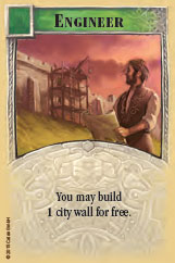 Take a city wall and put it under one of your cities. A city wall increases the number of cards you can safely hold in your hand when a "7" is rolled, by 2 cards.