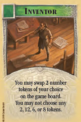 You can improve your production! You may choose any two number tokens (except 2, 12 6 or 8) and switch their places on the board. You do not have to have a settlement or city next to the hexes with the numbers you are swapping.
