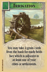 Example: You have two cities next to a fields hex. You have a settlement next to a different field. If you play the Irrigation card, you will receive 4 grain cards.