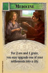You may upgrade a settlement to a city for 2 ore and 1 grain. When you play this card, you save 1 ore and 1 grain. You may not combine two of these cards for the same city.