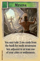 Example: You have 2 settlements next to a mountains hex, and a city next to a different mountains hex. If you play the Mining card, you will receive 4 ore cards.