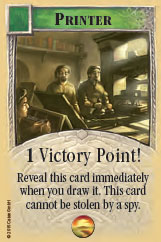 You may not keep VP cards in your hand. It does not count toward your hand limit of 4 progress cards, and it may not be stolen by the Spy.