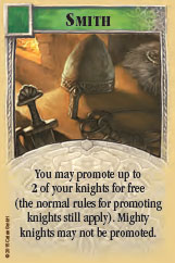 You may only promote a "strong" knight (level 2) if you have built the "Fortress" city improvement (politics-blue). You may only promote a knight one level per turn.