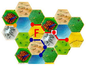 Since there is no robber in this game, in the case of a rolled 7 the 'firestorm' becomes active. The player who has rolled the 7 may place the token 'firestorm' on a hex of his choice (exception: desert + water). As long as the token, this hex produces no resources.