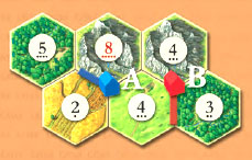 • Alle spelers die nederzettingen of steden grenzend aan een veld met hetzelfde nummer ontvangen van de opbrengst van die velden.