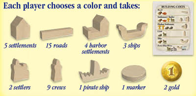 Using the turn order described in base Catan, each player places a harbor settlement first and a regular settlement second on the starting island (each without a road). Your harbor settlement must be placed on one of the intersections marked with a circle (