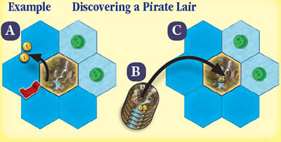 If you discover a gold field hex, it is always occupied by a pirate lair. You immediately receive 2 gold for the discovery as shown in example A (below). You then take a pirate lair token from the supply stack (example B) and place it (without turning it over) on the pirate lair (example C).