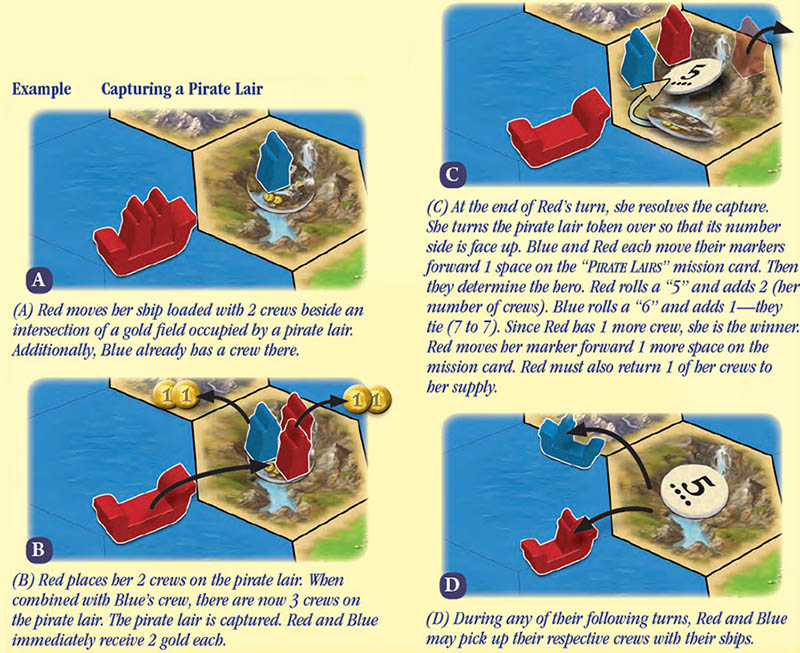 During pirate missions your crews can become warriors. If your ship has 1 or 2 crews on board, and one end of the ship points toward an intersection of a pirate lair hex, you may place these crews directly on the pirate lair token if you wish. A maximum of 3 crews may stand on a pirate lair.