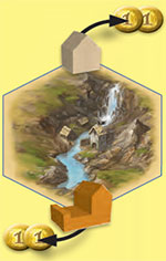 Each player who participated in the capture immediately receives 2 gold as a reward. In addition, each participating player moves his or her marker forward 1 space on the mission card's victory point scoring track (mission progress). The player whose turn it is begins; the other players follow in clockwise order.