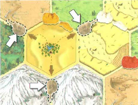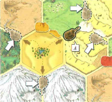 Starting from the oasis, three independent caravan routes develop. A camel is always put beside a path (edges of 2 adjacent landscape tiles). A camel must always be placed so that it points away from the last camel placed on the chosen route. A branch from a caravan route is not allowed.