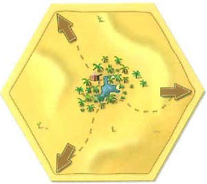 The oasis tile replaces the desert. The three arrows specify the starting points of three caravan routes. The oasis tile is placed exactly in the centre of the island. The arrangement of the arrows on the oasis is arbitrary. The camels are set near the play area.