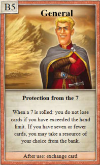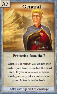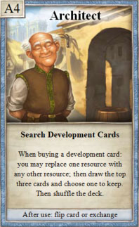 1× during your turn, when purchasing a development card, you can replace 1 of the 3 resources it costs with any other. Select the development card from the first 3 in the stack. Then, shuffle the stack.