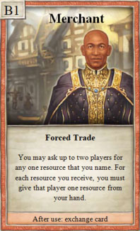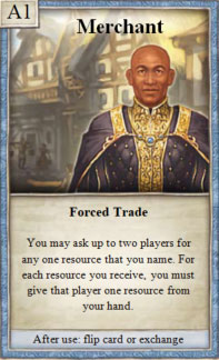 Demand a specific resource from up to 2 players. For each resource you get, give the player any one resource in return.