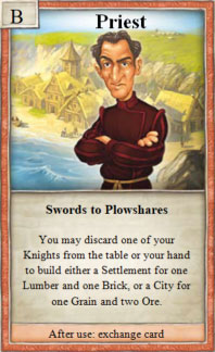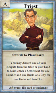 1× per turn, you can put one of your knights put on the discard pile, and then either build a city for 2 ore and 1 wheat, or build a settlement for 1 lumber and 1 brick.