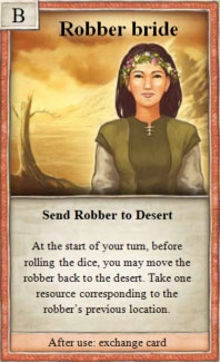 On your turn (even before rolling the dice), you can move the robber to the desert. You receive 1 resource from the landscape from which you pulled the robber.