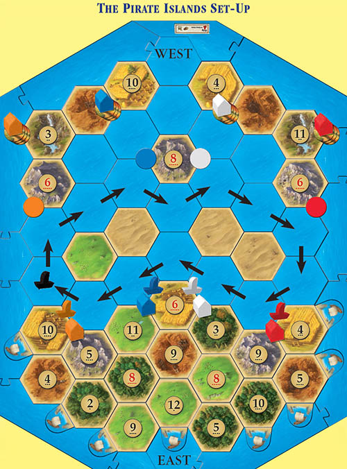 One settlement and one ship of each color are placed on the coast of the eastern island, as shown. The eastern island can be colonized in a normal fashion; all other islands are "pirate islands".