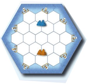 First off, two settlements (without a road!) of the neutral players should be placed in accordance with the illustration below. Afterwards both players create their two starting settlements with roads according to the normal establishment rule.