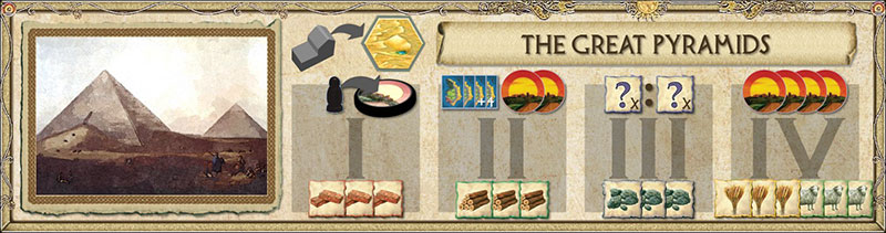 You must progress through all four stages before your Wonder is complete. To do so, pay the resource cost for the next stage and move your marker up one. You may only upgrade each Wonder once per turn.