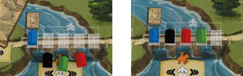 Example: On their turn, Blue chooses to pass their turn. Therefore, they place their House on the first available space of the Guilds Bridge.