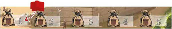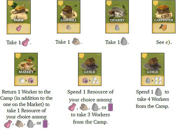 Buildings are activated one after the other, going from the City Gate (on the lower left side corner) and following the Road up to the Provost. A player who has 1 Worker on an activated Building can apply its effect once. Then, they return that Worker to the Camp.