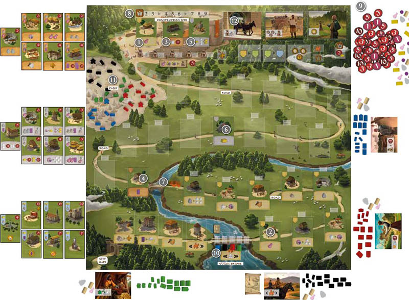 Each player chooses a color. They take the corresponding Houses and place 1 of them under the Guilds Bridge 10.They also take Workers in their color. The number of Workers is based on the number of players: