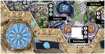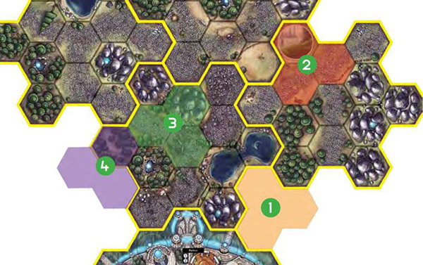 3 The green location is a valid placement for an earthscape. Take care when placing an earthscape here, as its orientation cannot remove the only path that connects your fortress to the others. Once placed, you may construct a spire on this earthscape by spending its Source cost, as this earthscape's new Source Well(s) will also fall within your area of influence.