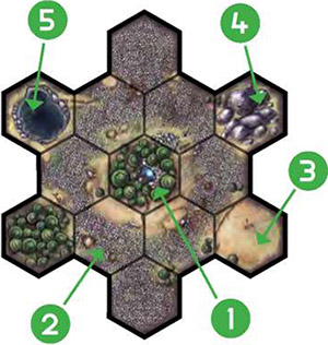 1 Forest (featuring a Source Well), 2 Path, 3 Plains, 4 Mountains, 5 Water.