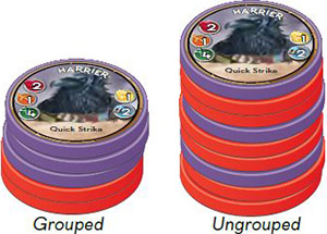 There is no limit to the number of minions that may be placed in a group. The Prep Phase is the only time that a group of units may be formed. When deploying minions as a group, begin by placing all unit chips you would like to group together in a stack. Minions must be grouped in order based on their movement stat
