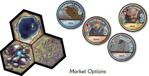 The market is comprised of mercenaries and supplies from the world below that have been transported up to the islands through gateports. Each faction has the opportunity to hire merc heroes and minions, purchase plans for new spires, and buy equipment to help them in their endeavor to defeat their opponents.