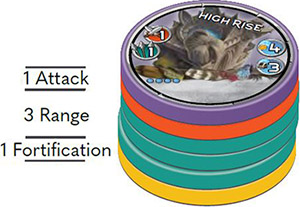 Since this high rise does have a range upgrade, its range is 2 and it is therefore able to attack any unit in the pink hexes as well.