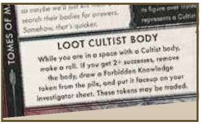 While you are on a space with a Cultist body, make a roll. If the roll has 2 or more successes, you manage to loot the Cultist body.