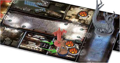 Ian has 3 successes to distribute as hits. He decides to use 2 to kill the Cultist, removing the figure and, using his Brawling skill, applies the last success as a hit to the Fire Vampire.