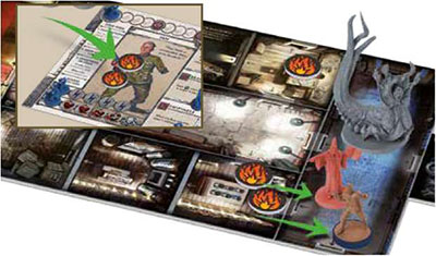 Ian finishes his Run by moving into a third space, which contains a Fire Vampire. Again, the Cultistfollows him. He is also leaving a space with 2 Fire tokens, so he takes 2 Fire tokens from the reserve and adds them to his investigator board.